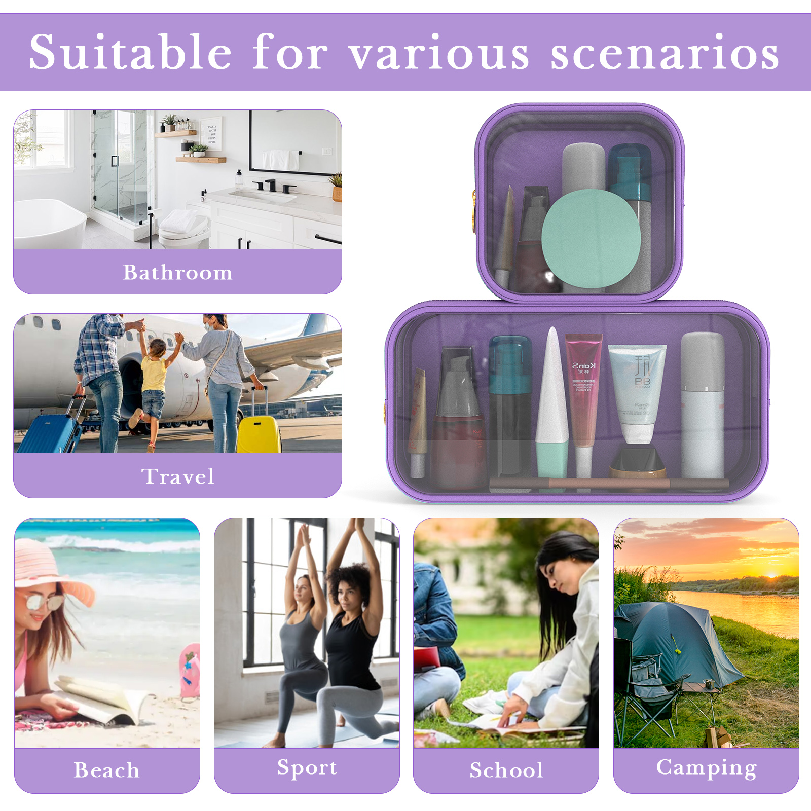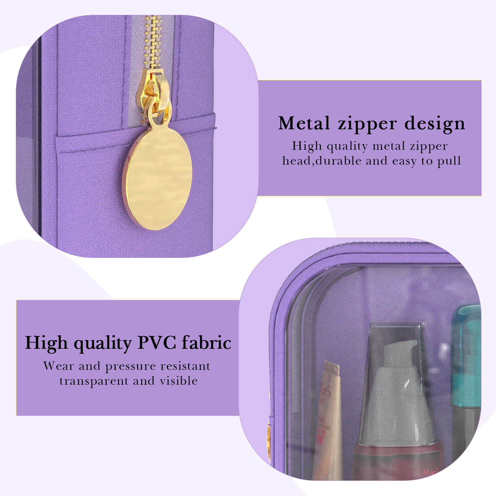 Clear Makeup Bag Set of 2, TSA Approved Waterproof Travel Cosmetic Bag, PVC Nylon Portable Makeup Organizer Bags for Women (Purple)