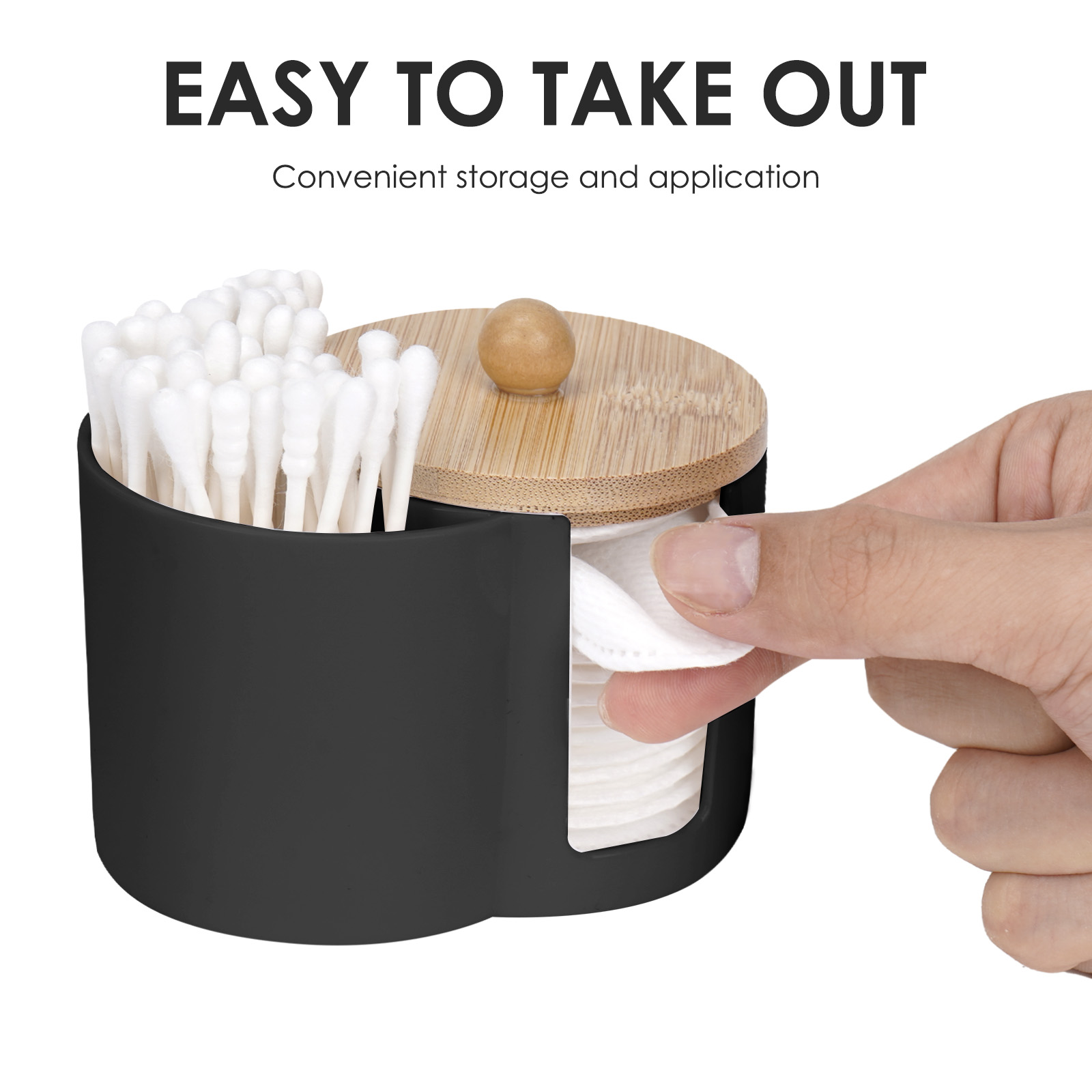 Cotton Swab Holder,Cotton Pad Holder, Small Plastic Cotton Swabs Dispenser with Lid, Bathroom Accessories Storage Organizer for Swabs, Pads, Floss Picks (Black)
