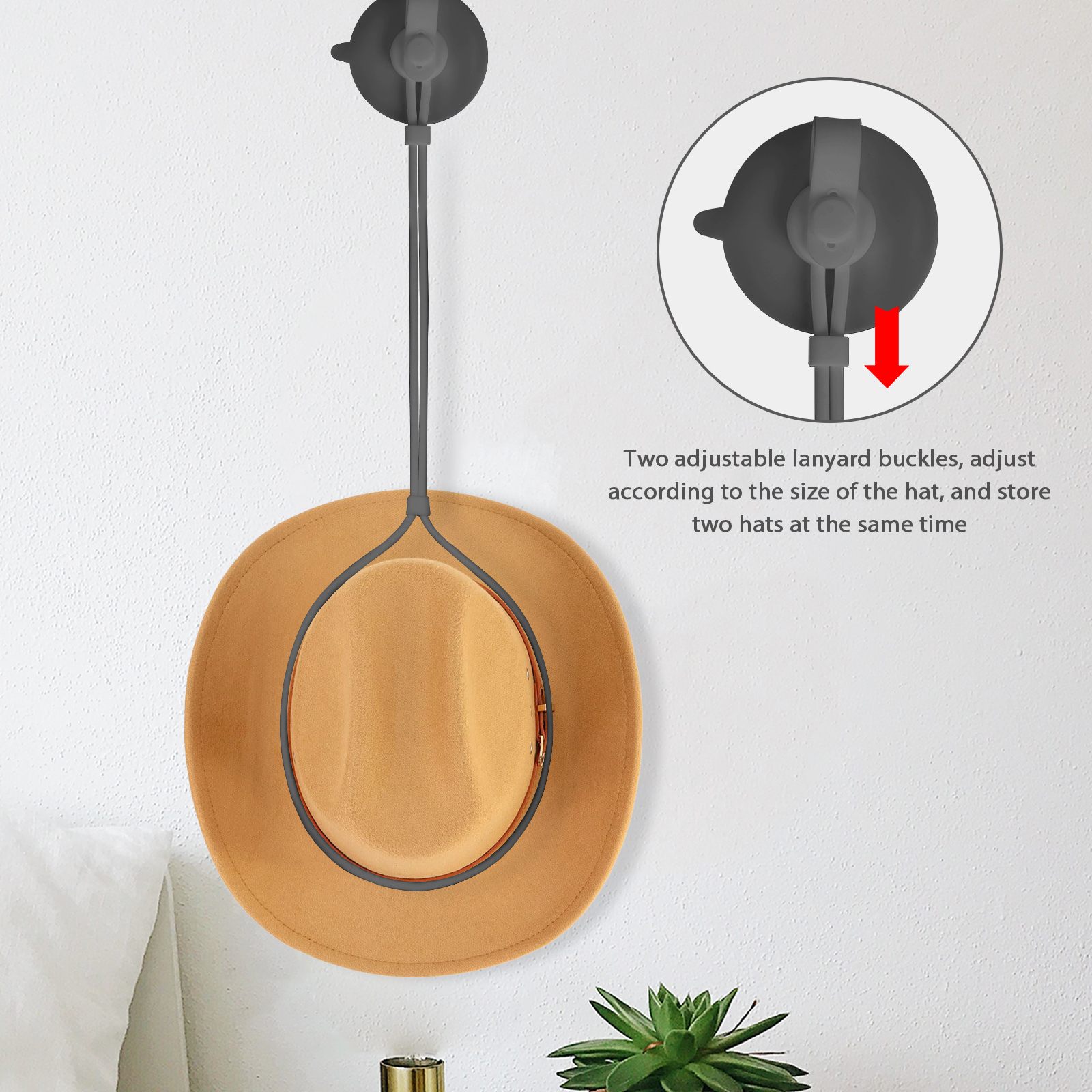 Cowboy hat mount has 2 adjustable lanyard buckles, adjusting to the size of the hat and can store two hats at the same time.