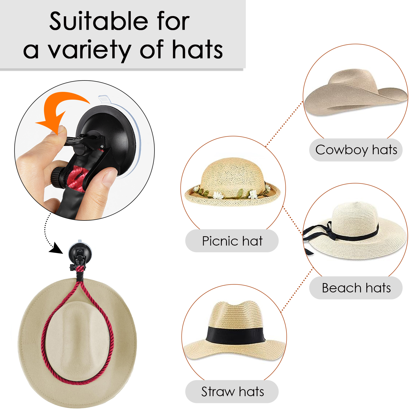 Universal hat holder with silicone suction cup to firmly fixed to the windshield or dashboard, not easy to fall off.