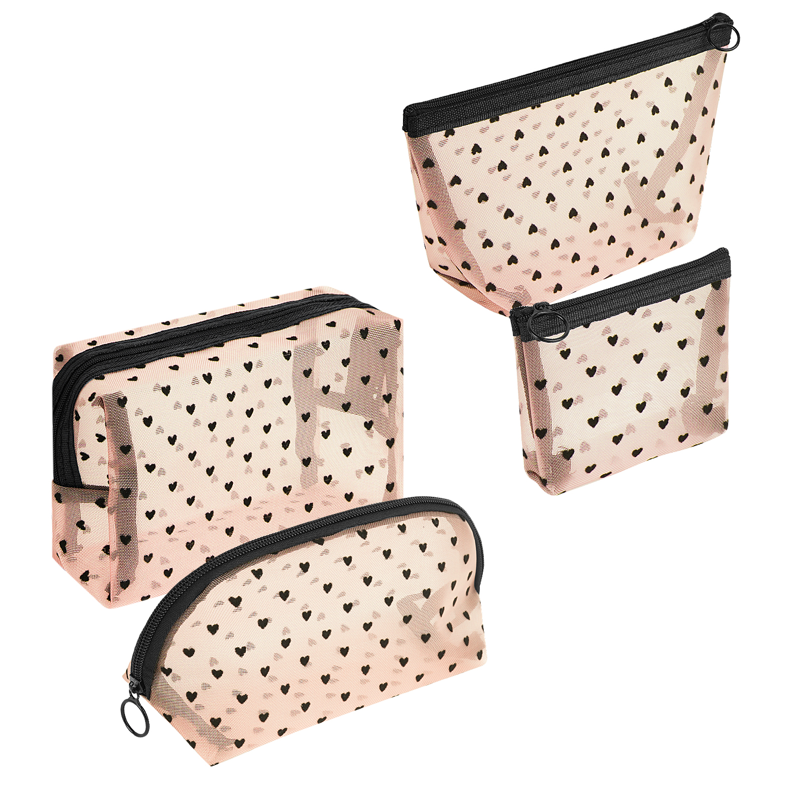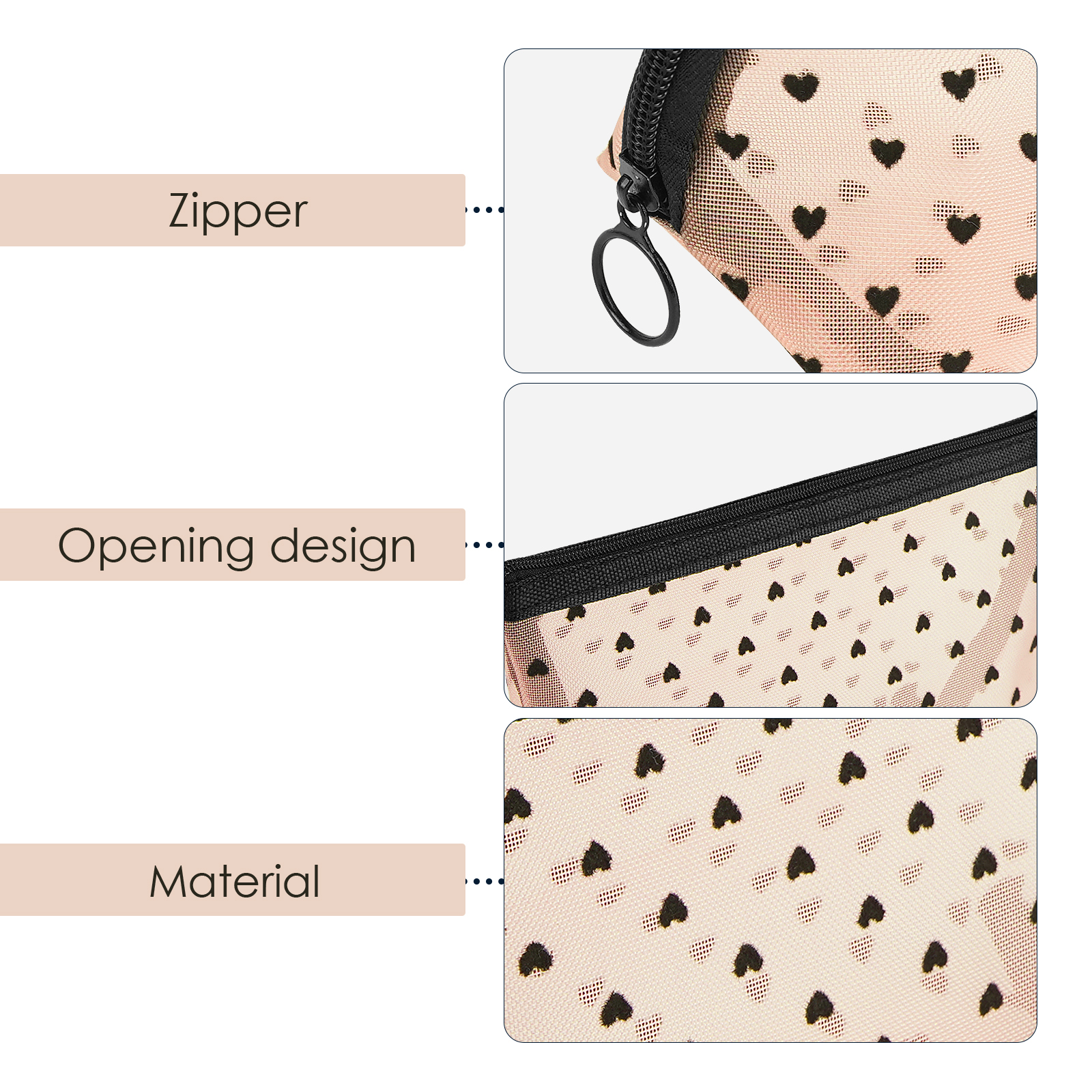 Pieces Mesh Cosmetic Bags, Portable Travel Mesh Makeup Bag, Heart Print Zipper Pouch Toiletry Bag for Women Girls (Beige)